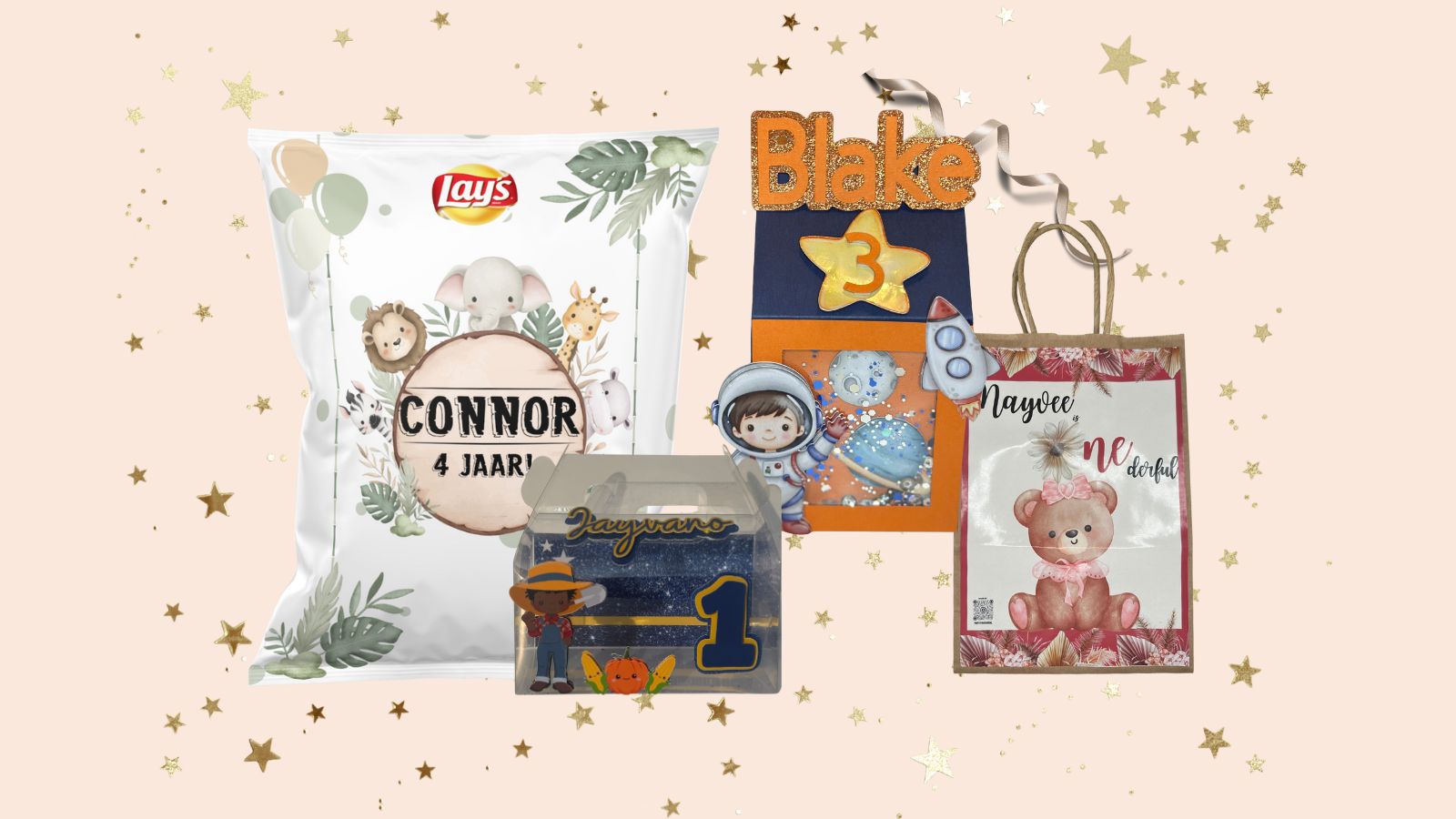 Van gepersonaliseerde bedankjes tot trendy goodiebags en feestelijke decoraties – wij zorgen ervoor dat elk detail klopt. Ontdek ons uitgebreide assortiment en laat je inspireren! Bestel vandaag nog en maak van jouw event een feestje om nooit te vergeten!